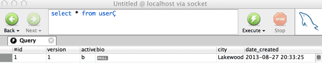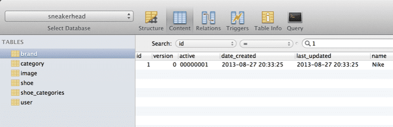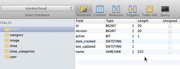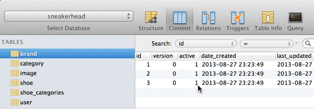 So now that we have MySQL up and running we can take a look at the big GOTCHA I ran into tonight. I have a domain class (many actually) that define an active flag (boolean). If we take a look at my Brand domain you will see our boolean active property. This is meant as a flag to tell if the Brand should be active or not.