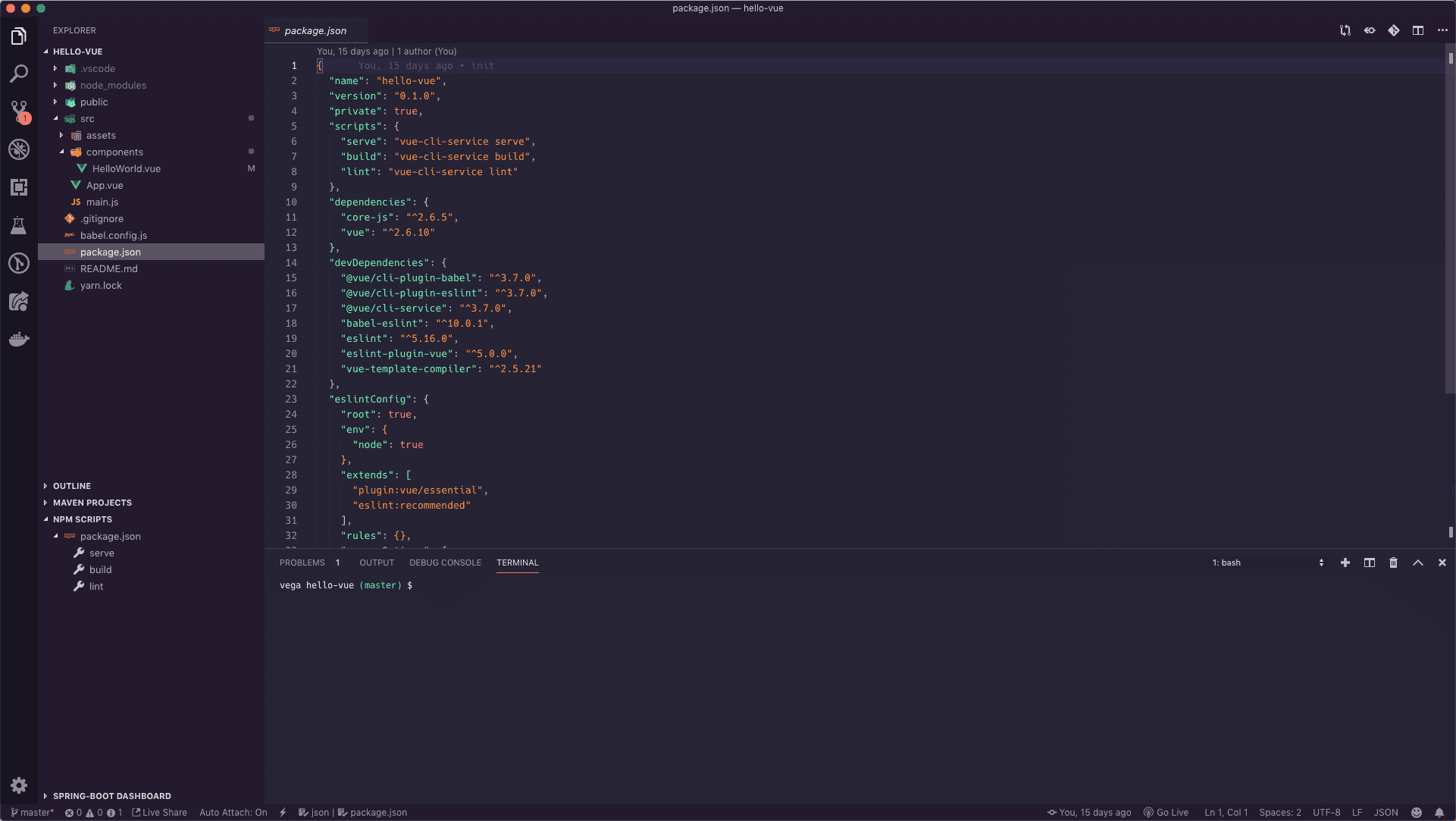 If you're new to Node & NPM the good news is you don't need to know everything to get up and running. Whenever you see a package.json just know that this file is there to help you manage your project. In this file, you will find metadata about the project, packages that this project depends on and scripts that are available to run. Here is a simple package.json of a project created using the Vue CLI.