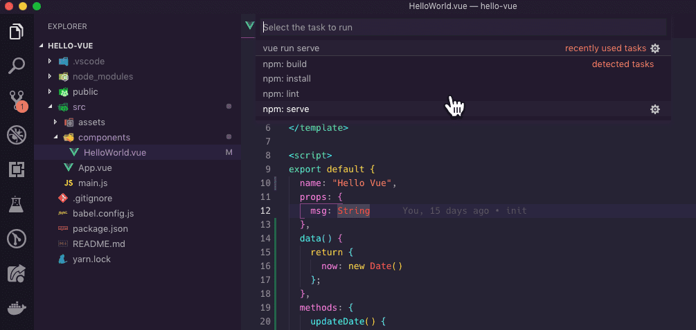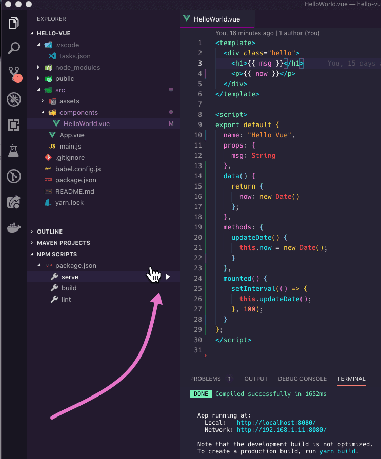 With your project open you will now have a NPM Scripts Explorer in the sidebar. If you click on the play icon next to the script name it will run the script for you, how awesome is that!