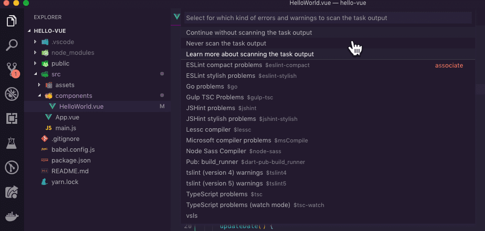 You can click on npm:serve or you can start typing the word serve and hit enter when it's selected to run it without using your mouse. If you see the following options you can go here to learn more about scanning the task output.